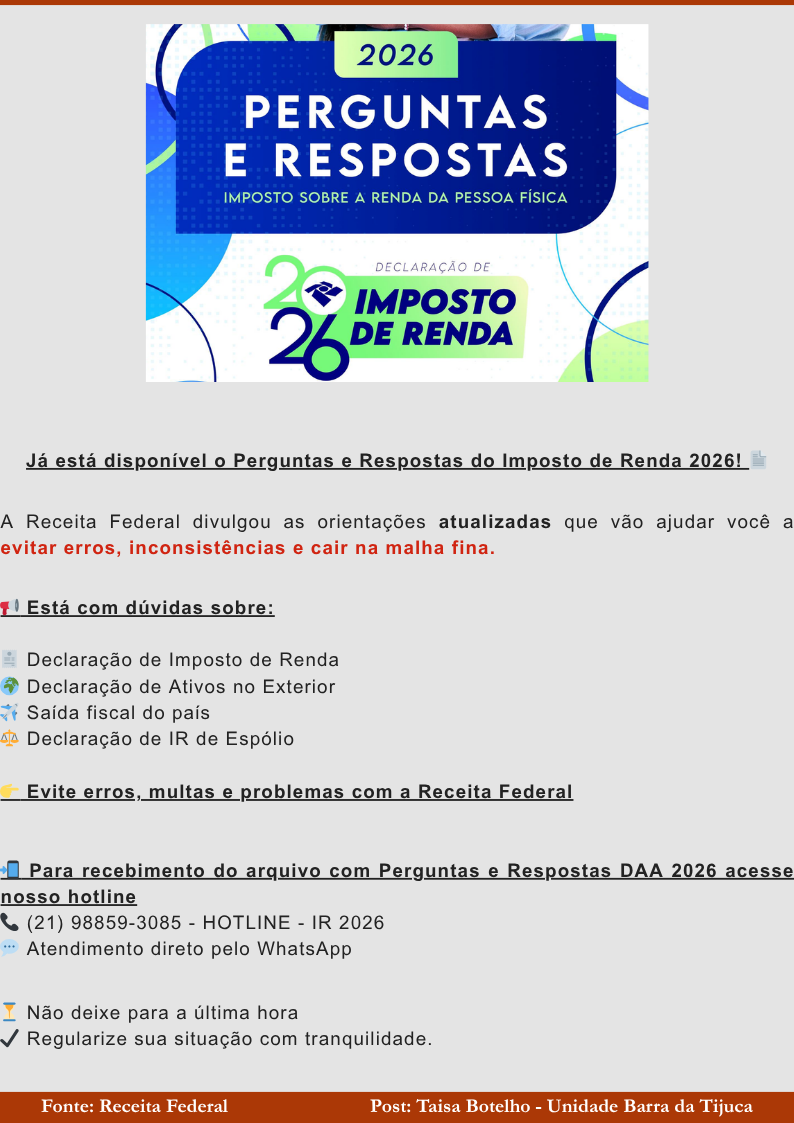 Disponibilizado o Perguntas e Respostas do Imposto de Renda 2026